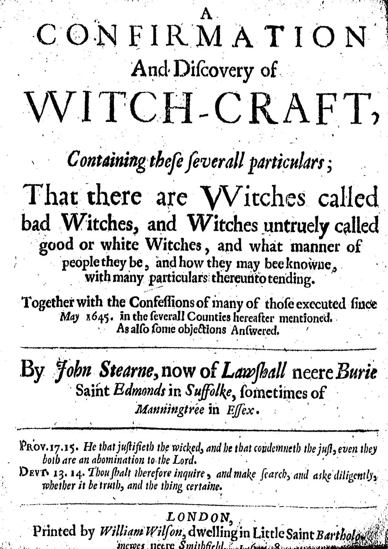John Stearne was a wealthy landowner, self described as a “plaine country man”, presumed to have been born around 1610 and in his mid thirties in 1645. He was from Suffolk, possibly born in Long Melford, but by 1645 split his time between his family residence in Lawshall near Bury St Edmunds and in Manningtree where he owned a house. His wife Agnes remained at Lawshall with their first child, a girl who had been baptized in 1644. His writing in A Confirmation suggests he was educated to some degree. and that he held a strong Puritan conviction.